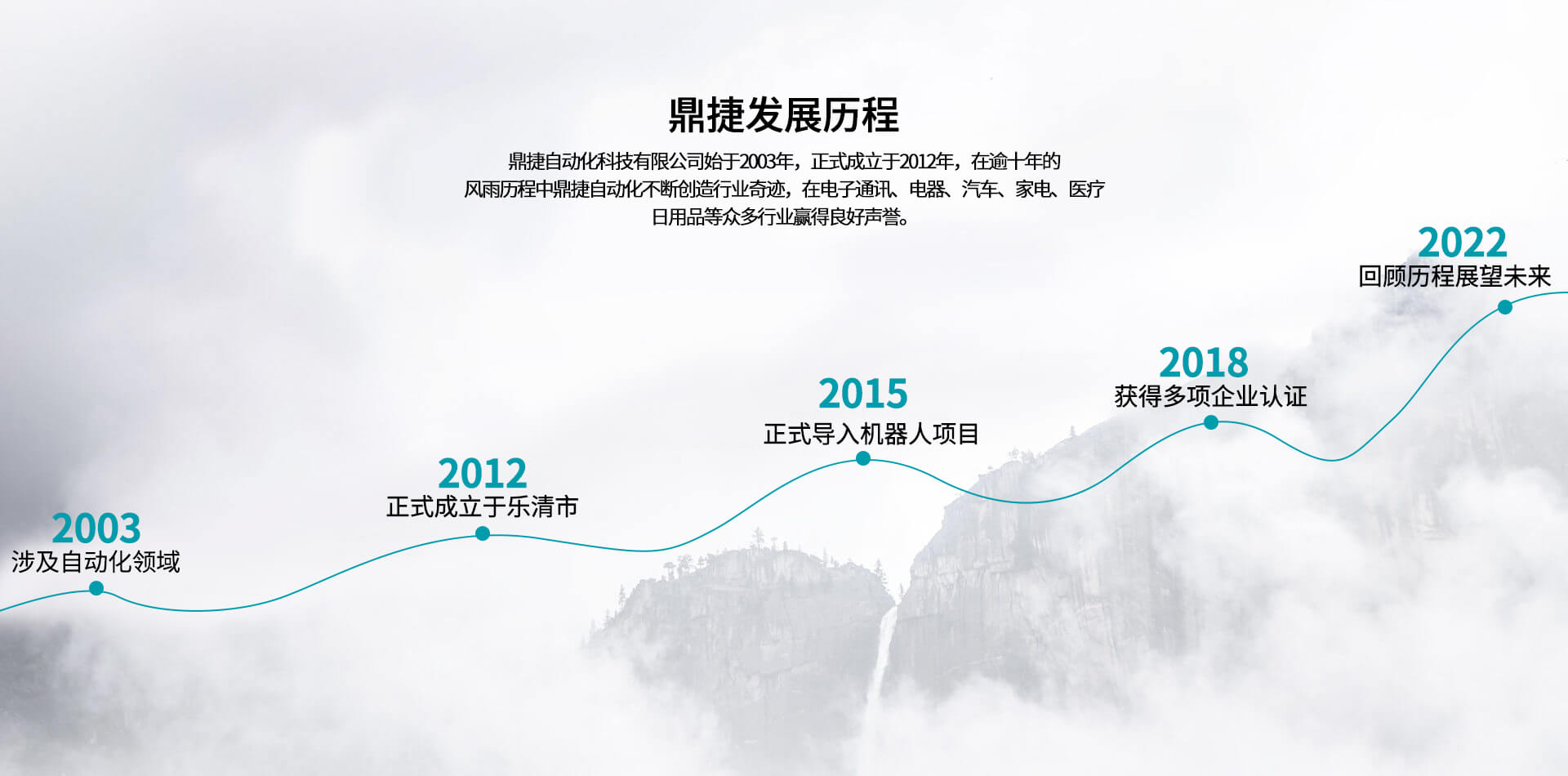 公司始于2012年,在逾十年的風雨歷程中,不斷創(chuàng)造行業(yè)奇跡,在電子通訊、電器、汽車、家電、醫(yī)療、日用品等眾多行業(yè)贏得良好聲譽。公司坐落于浙江省樂清經(jīng)濟開發(fā)區(qū),現(xiàn)有人員63人,擁有經(jīng)驗豐富的工程技術研發(fā)團隊11人,其中高級工程6人,具備本科以上學歷高級工程人員比例78%;同時鼎捷自動化在蘇州,東莞等地設立分公司以服務目標市場客戶,目前鼎捷自動化已經(jīng)為下客戶提供配套自動化解決方案:泰科、安費諾、莫士、華為、中興、普聯(lián)、智英、意華、德豐、公牛、萬事達、華豐、飛雕、普思、冠聯(lián)、俊朗松田、進聯(lián)、高正、盛凌等。鼎捷自動化專業(yè)從事連接器、開關及相關電子、電器、五金、塑膠產品組裝自動化定制、設計、制造、銷售。2012年,鼎捷自動化正式導入機器人應用項目,可為各類客戶提供電子、電器、汽車、五金、塑膠等集成自動化智能組裝系統(tǒng)。